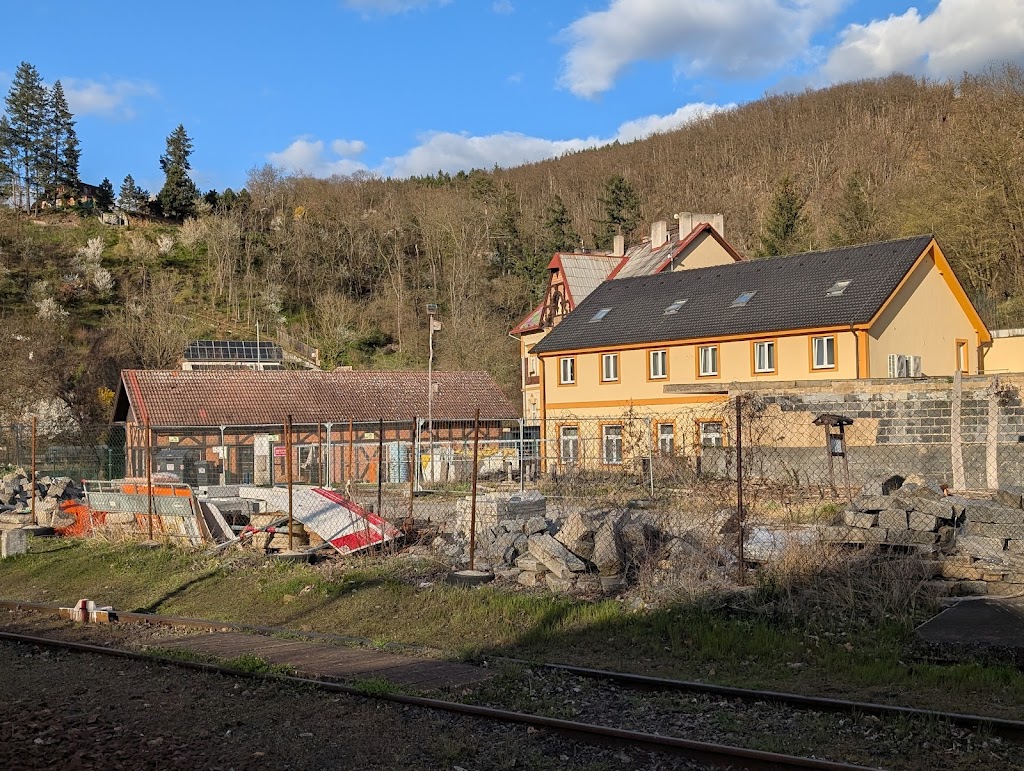 Na nádraží má nádražní budova novou fasádu a ani ji nemuseli bourat, akorát stačila ta nová krásná žlutá fasáda. Nástupiště je zde sice staré, takové to uzounké a nástupní perón je pouze na jedné koleji myslím. Ale Správa železnic tu udělala nové černé kovové lavičky a i u nádražní budovy je dlažbový chodník.
