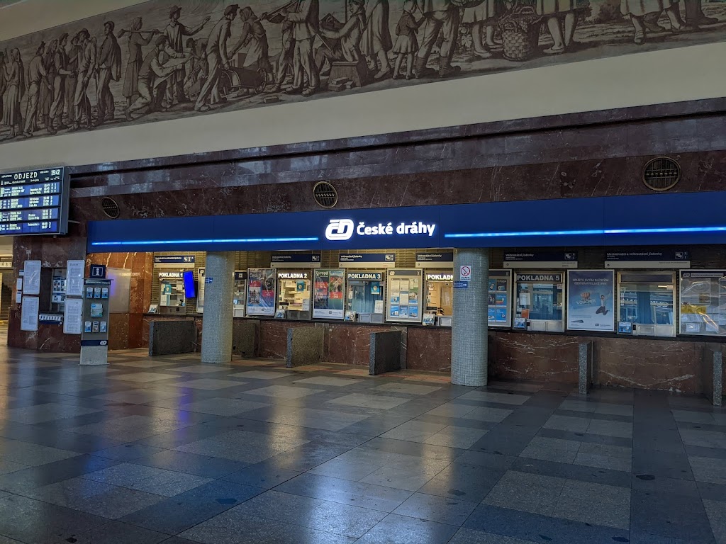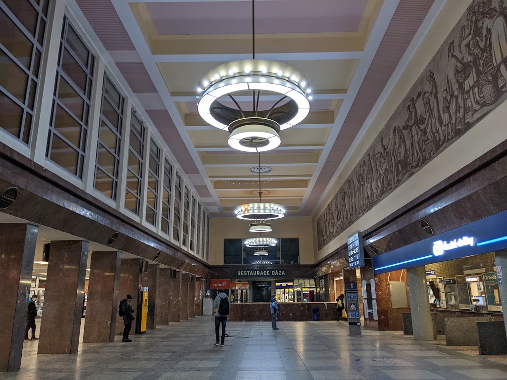 Tohle nádraží jsem nikdy neměla ráda. Bylo nepříjemné, staré, špinavé - o tom svědčily žvýkačky zážrané až do asfaltu, zažloutlé kachličky, stará světla v průchodech a cedule (to písmo je typické), oloupaná omítka či reflexní prvky na schodech. Celé nádraží s nástupišti a okolím je ponuré, budova je funkcionalistická, na mě zvenku působí stroze a stísněně. Na zařízení je vidět věk a propisuje se období vzniku v 50. letech (původní odbavovací budova byla zbourána). Ale jsou tu i nějaká pozitiva: samotná odbavovací hala nevypadá až tak zle, snaží se být moderní vybavením (digitální tabule, nové dveře, toalety - to je bohužel asi vše) a zároveň si zachovává historický ráz z budovatelské éry (fresky, stropy, lustry) - to je na vkusu každého, ale celkem to sedí k designu stavby. Přímo do haly vede stanice metra a najdeme tu restauraci, prodejny občerstvení, trafiky a automaty na kávu. V hale jsou narozdíl od nástupišť alespoň moderní sedátka, kterých je ale velmi málo a často je zabírají lidé, kteří na spoj nečekají. Jinými slovy hala je celkem velká, ale prázdná, většina plochy vyhrazená na čekání před odjezdovou tabulí nebo na koupi jízdenky je většinou zcela prázdná (no není to hlavák). Dala by se tu před sloupy umístit kupa laviček a nějaká ta kytka, aby to tu nepůsobilo tolik depresivně. Nicméně vzhledem k určitým pochybným lidem, kteří se zde zdržují, a v zimním období chladnu i uvnitř tu stejně nikdo nechce trávit moc času. Aktuálně je nádraží v rekonstrukci, takže jsem zvědavá (snad to za trpění výluk bude stát) a těším se, že to bude vypadat pěkně a moderně podle návrhu. Funkční jsou teď dvě nástupiště, přikládám i plánek cesty k nim.